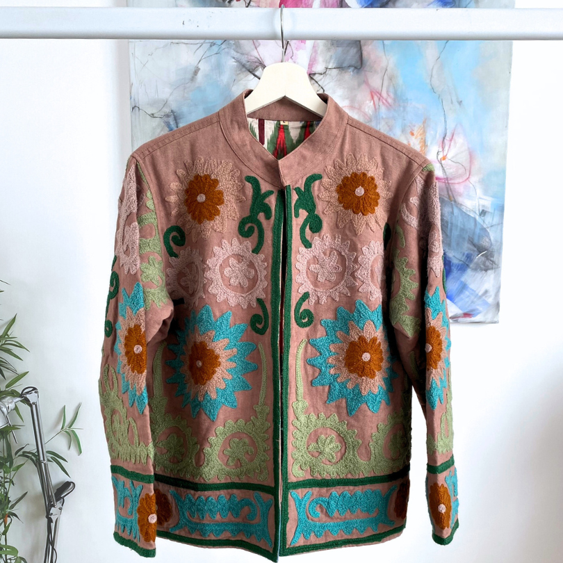 Nous fabriquons également des vestes Suzani vintage, sur demande uniquement, à partir des tissus que nous avons achetés et stockés et que nous utilisons pour créer une pièce inédite et authentique.