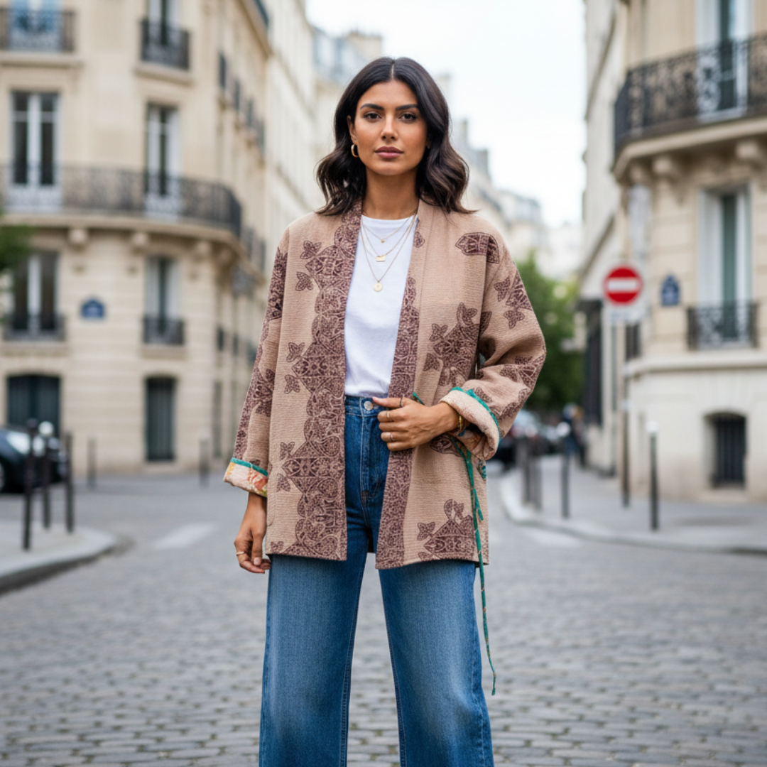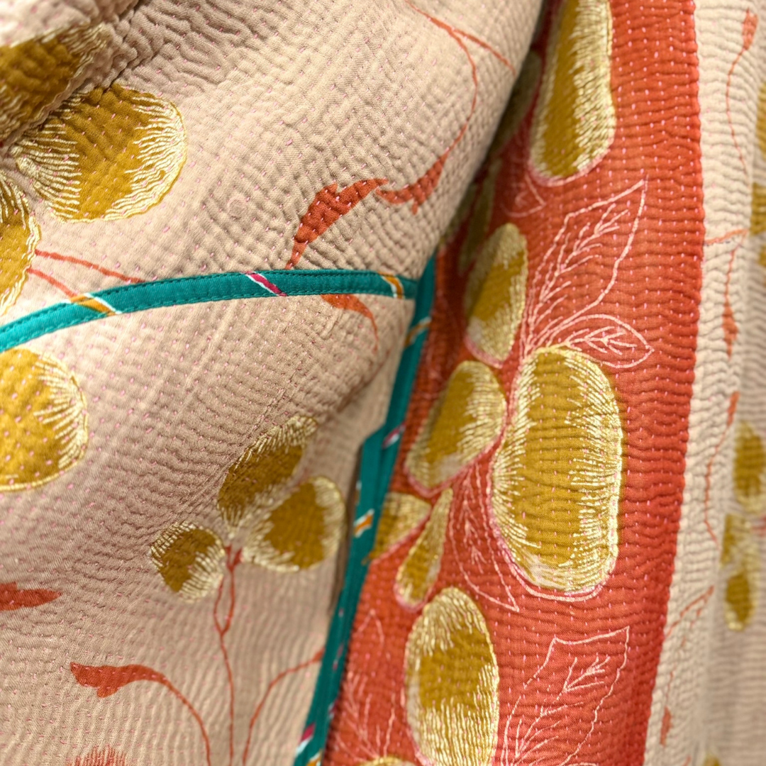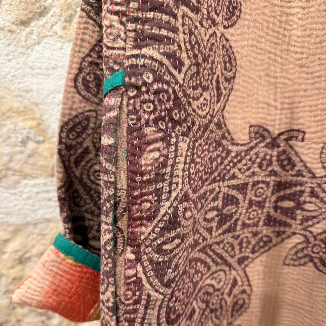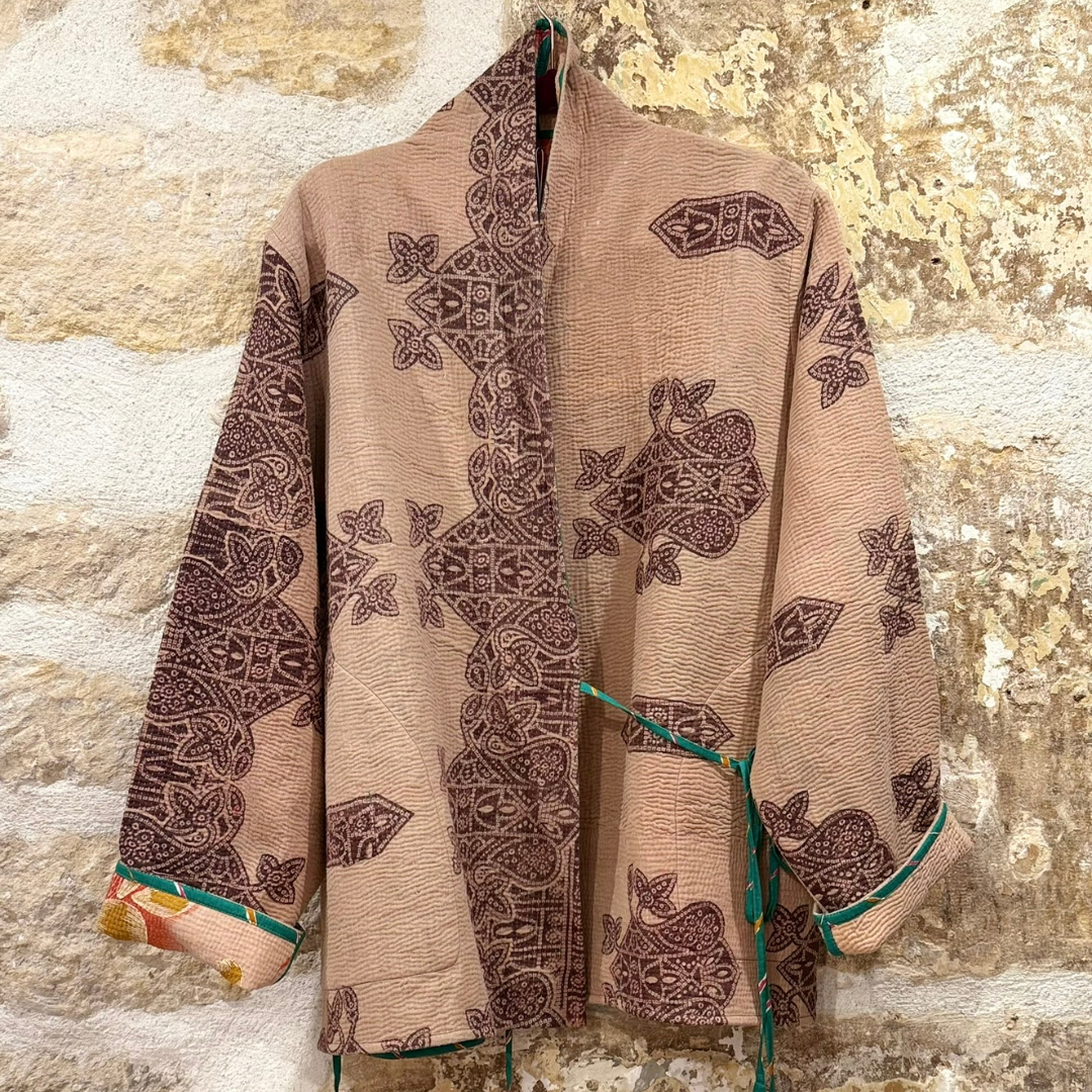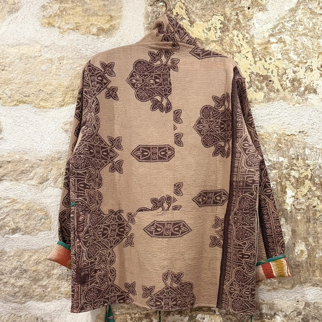 This jacket is a one-of-a-kind piece, handcrafted from vintage Indian Kantha textiles — traditionally created by layering and hand-stitching old cotton saris. Each piece carries the imprint of time, craftsmanship, and conscious reuse.