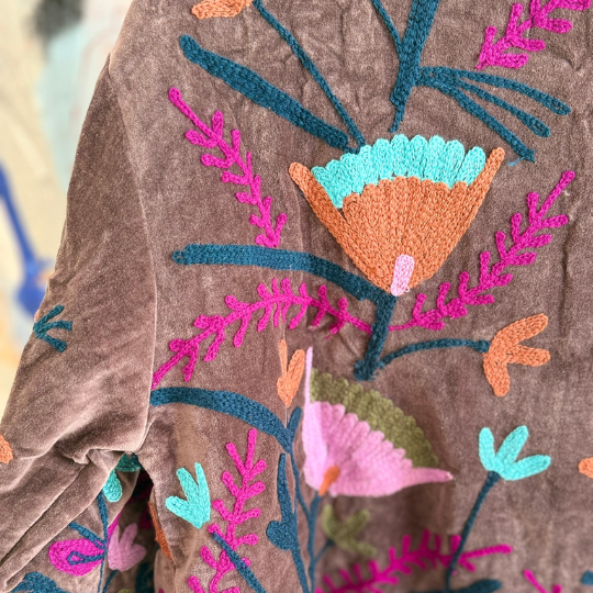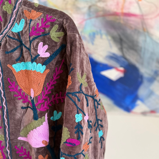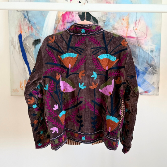 Crafted with exceptional attention to detail, this jacket is a testament to the timeless art of Suzani embroidery. Each piece is meticulously hand-embroidered with woolen threads and hand-stitched in small batches, ensuring its uniqueness and authenticity.