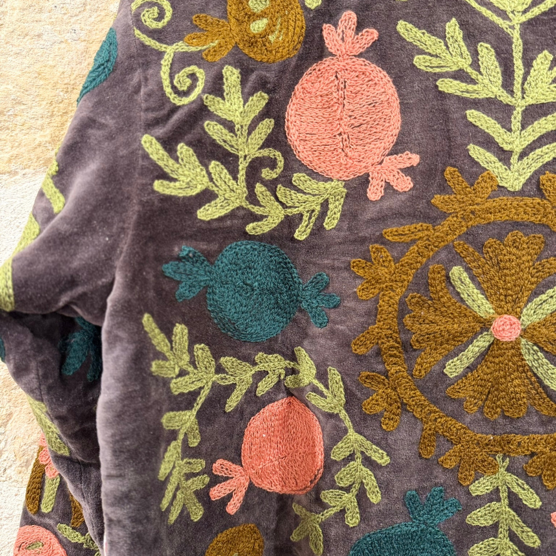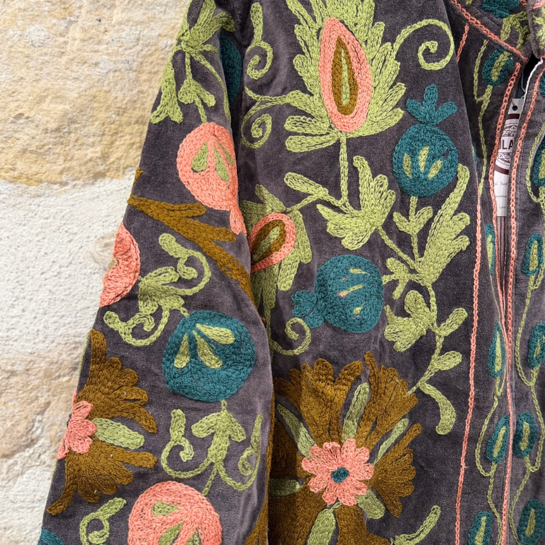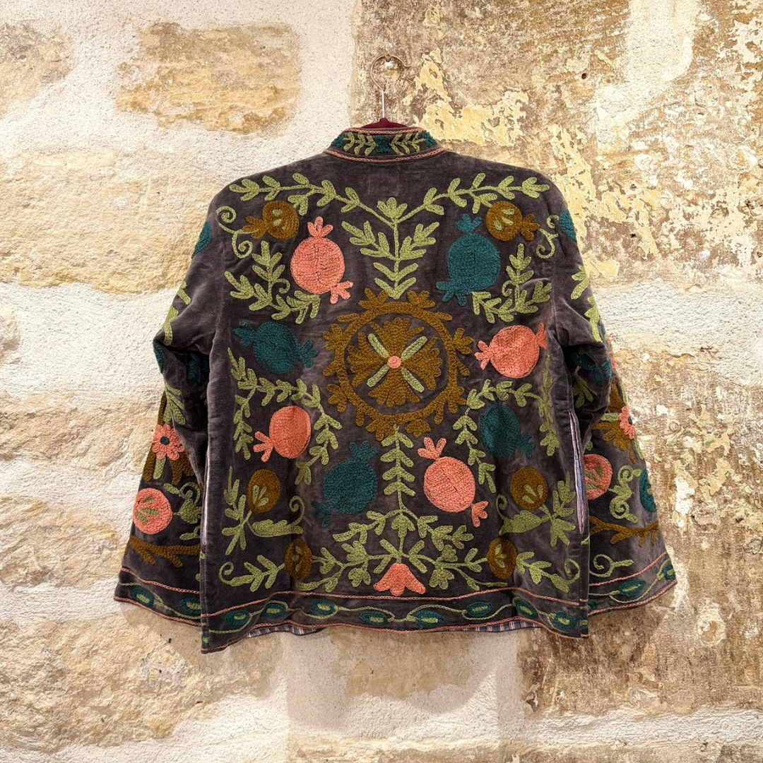 Crafted with exceptional attention to detail, this jacket celebrates the timeless art of Suzani embroidery. Each piece is meticulously hand-embroidered and hand-stitched by skilled artisans, making every jacket one of a kind.