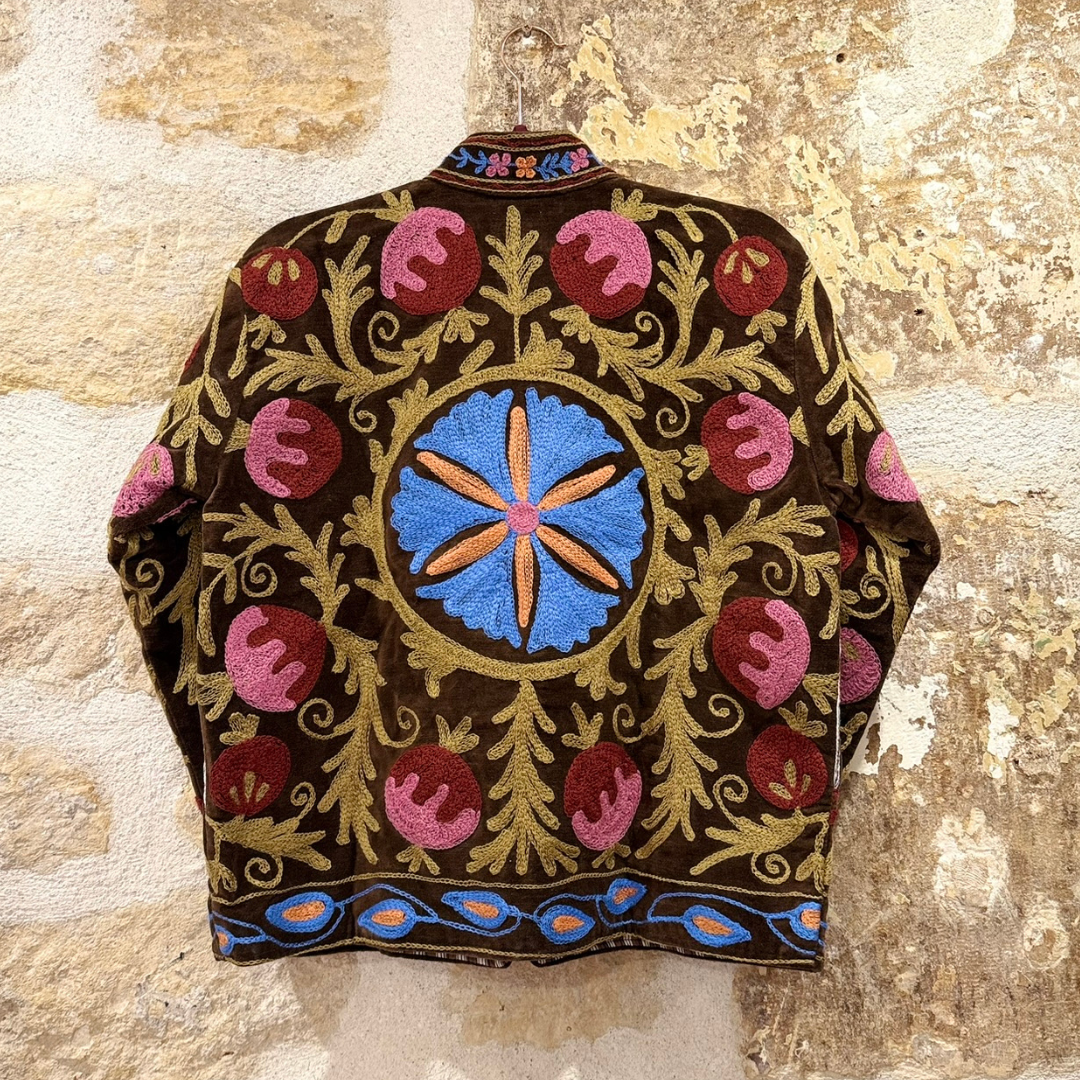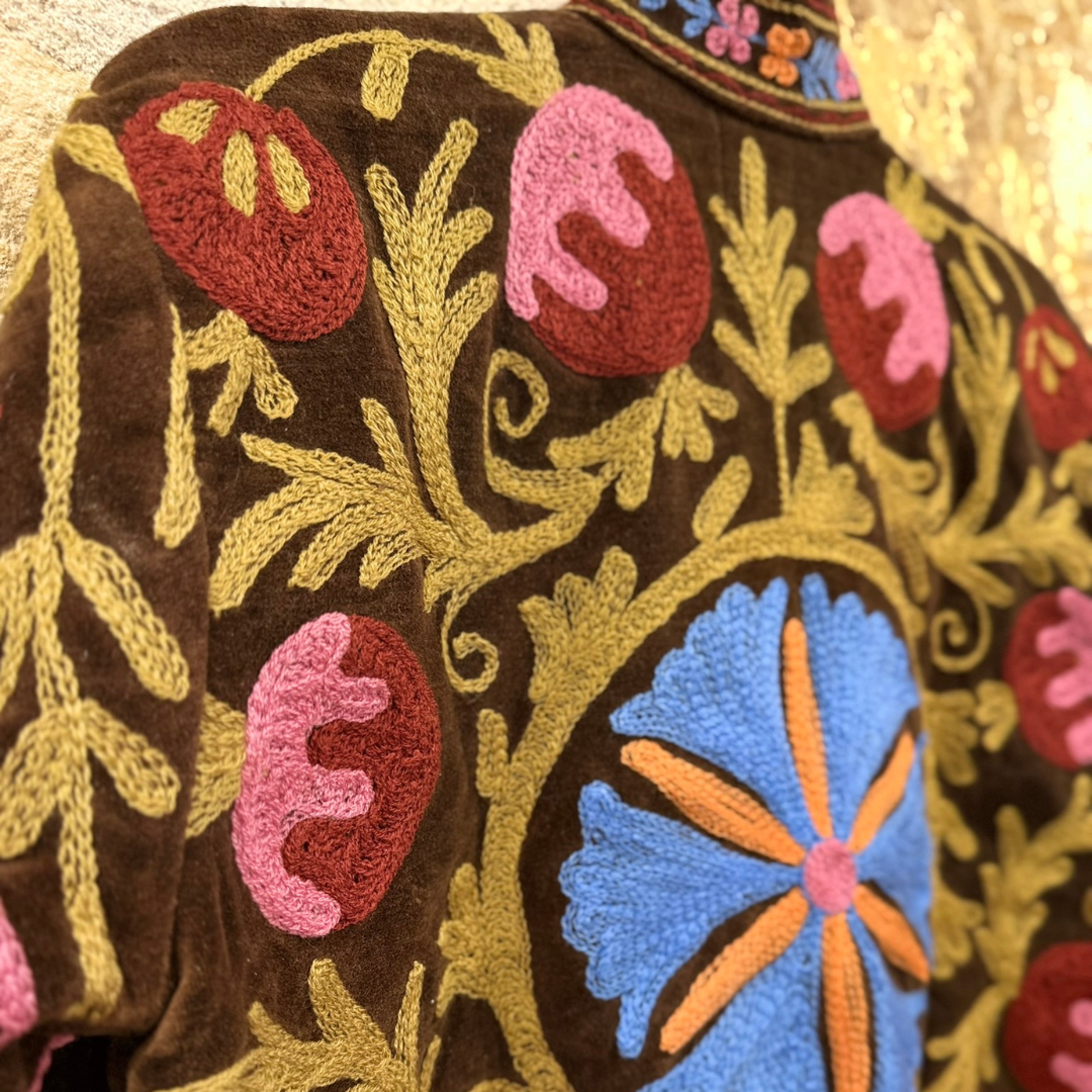 Crafted with exceptional attention to detail, this jacket celebrates the timeless art of Suzani embroidery. Each piece is meticulously hand-embroidered and hand-stitched by skilled artisans, making every jacket one of a kind.