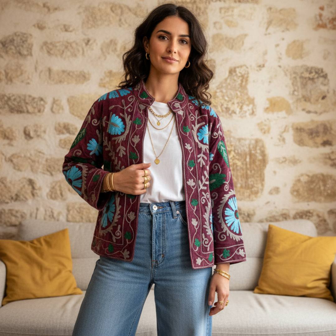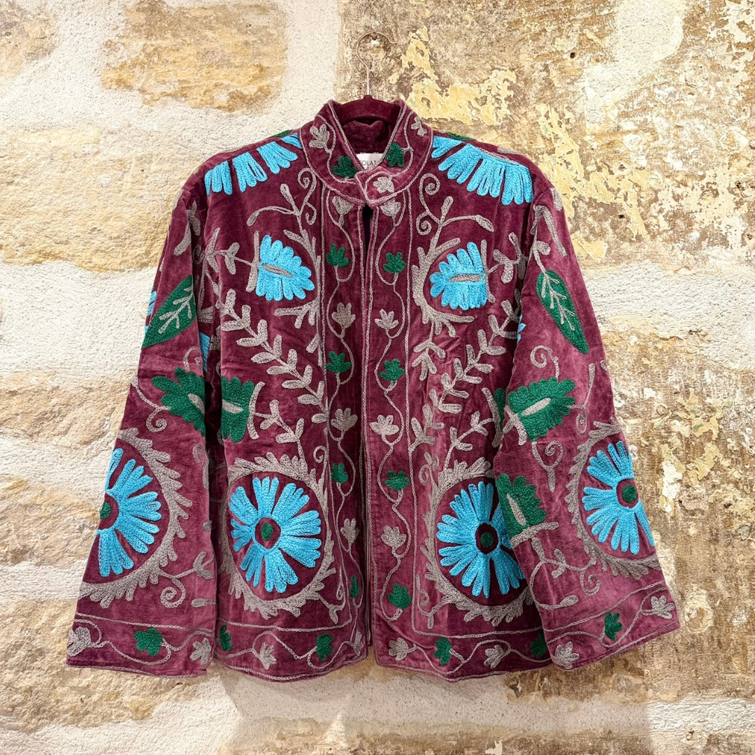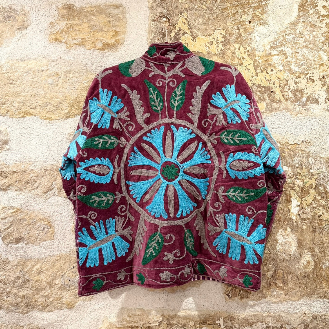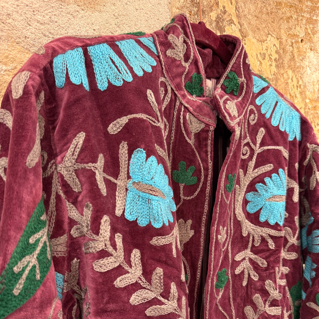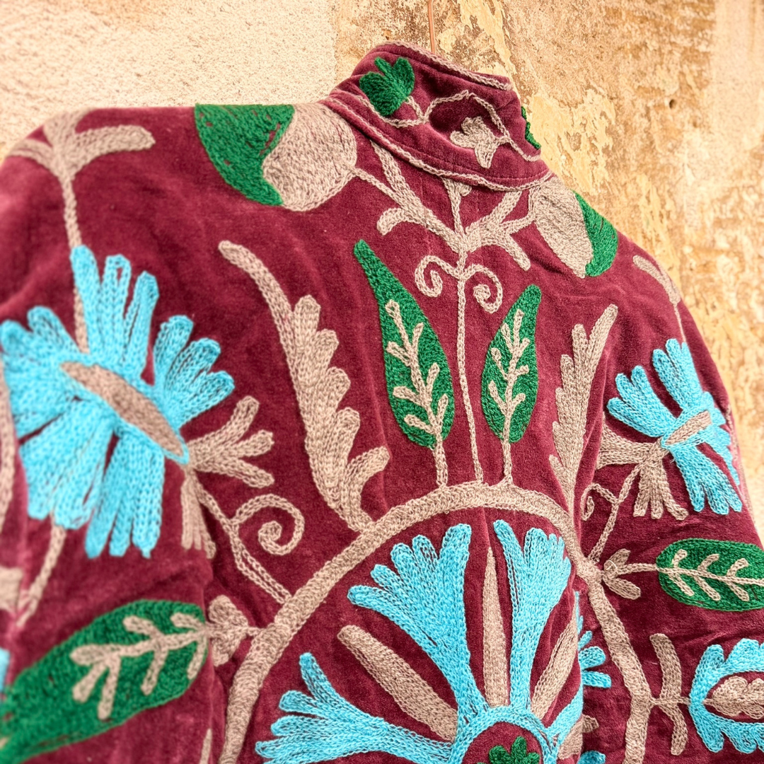 Crafted with exceptional attention to detail, this jacket celebrates the timeless art of Suzani embroidery. Each piece is meticulously hand-embroidered and hand-stitched by skilled artisans, making every jacket one of a kind.
