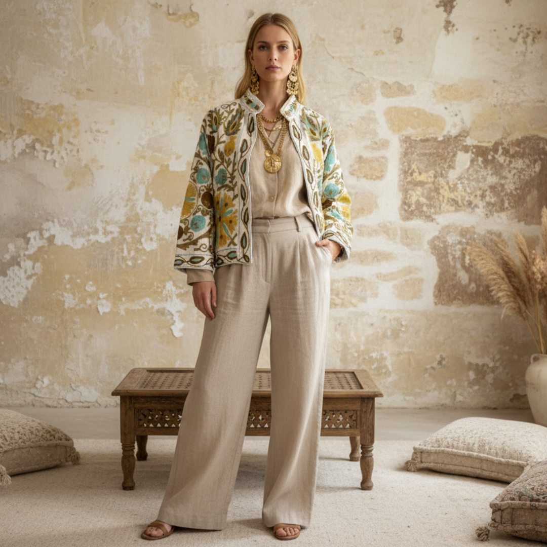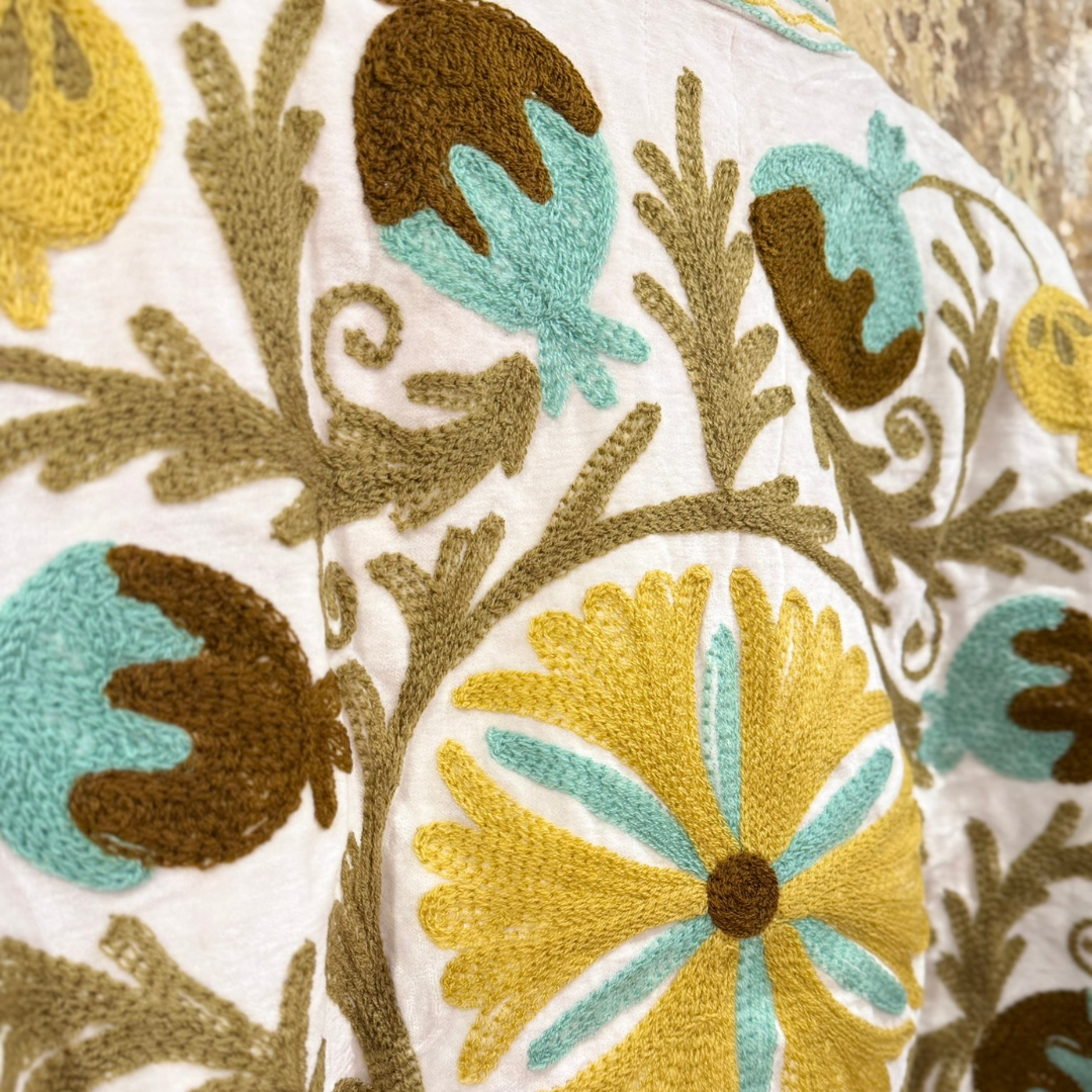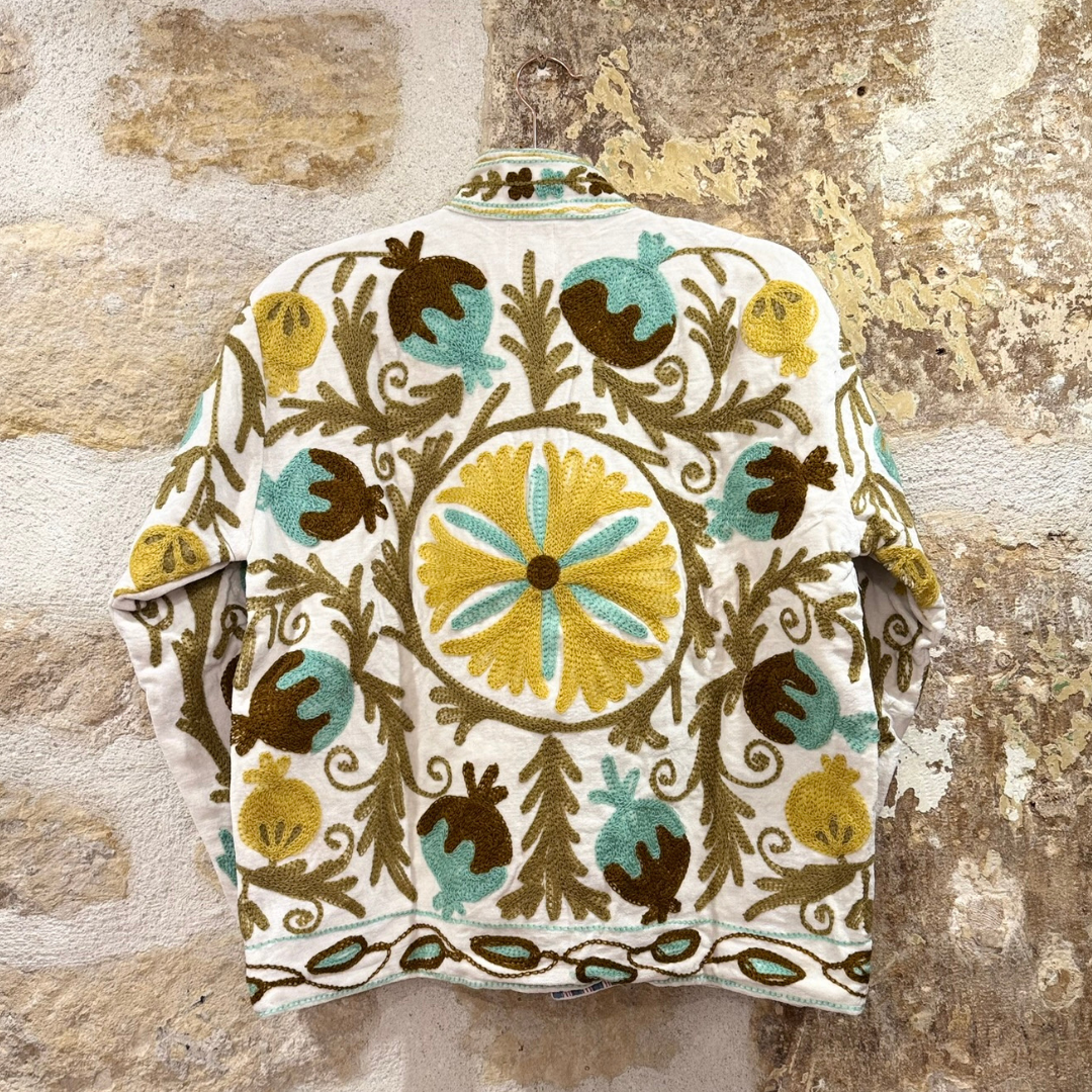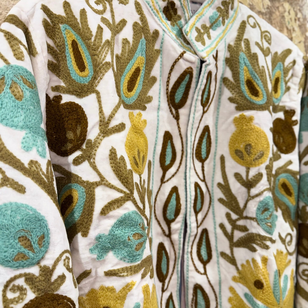 Crafted with exceptional attention to detail, this jacket celebrates the timeless art of Suzani embroidery. Each piece is meticulously hand-embroidered and hand-stitched by skilled artisans, making every jacket one of a kind.