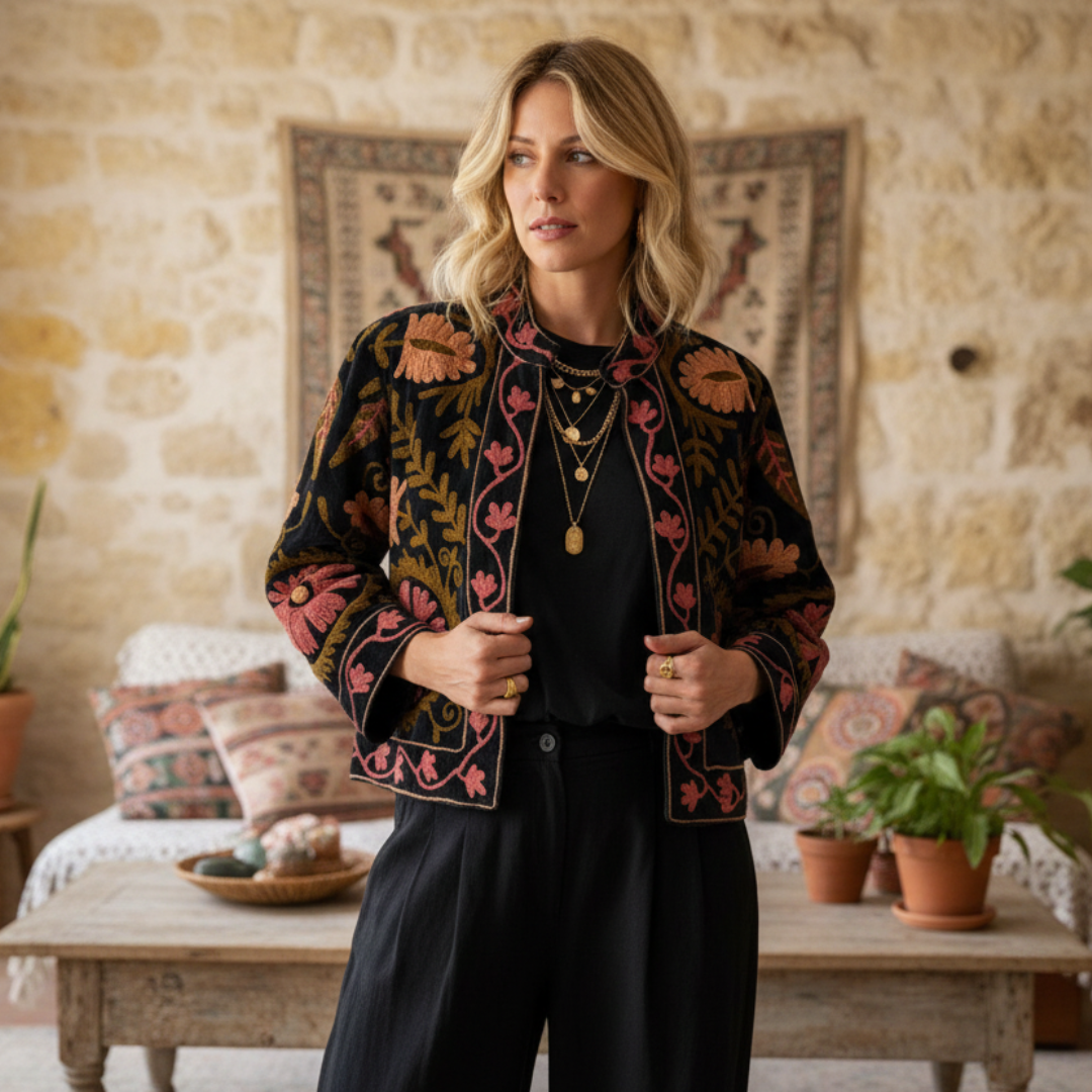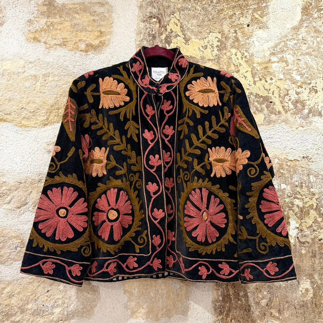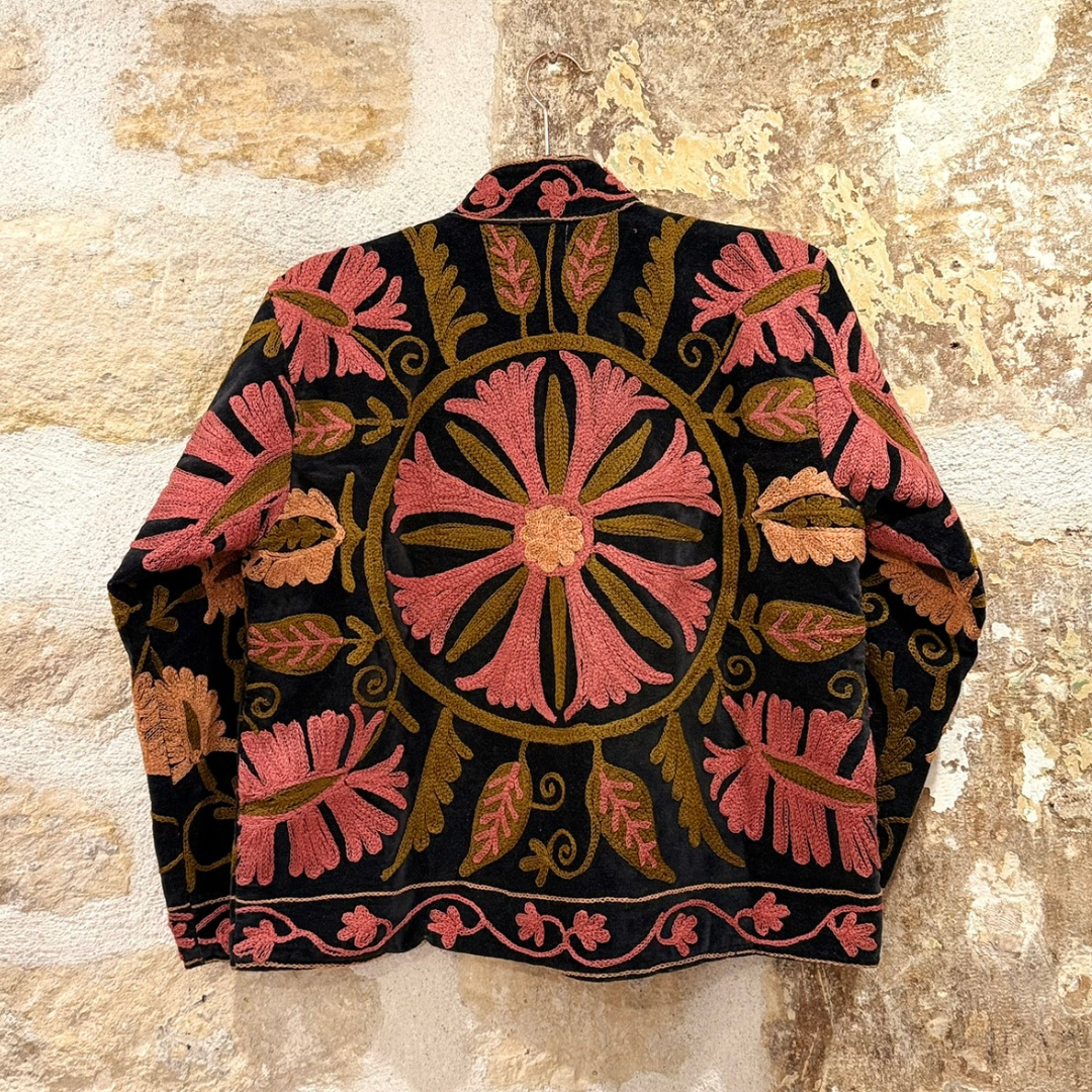 Crafted with exceptional attention to detail, this jacket celebrates the timeless art of Suzani embroidery. Each piece is meticulously hand-embroidered and hand-stitched by skilled artisans, making every jacket one of a kind.