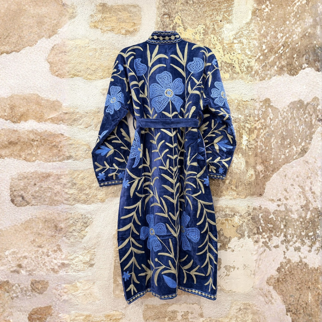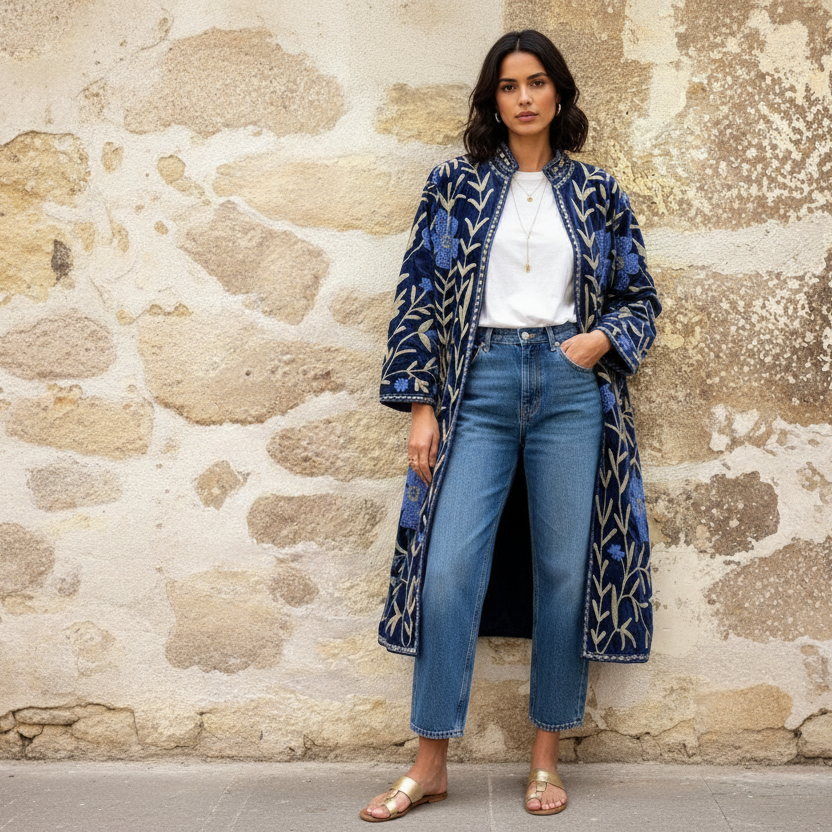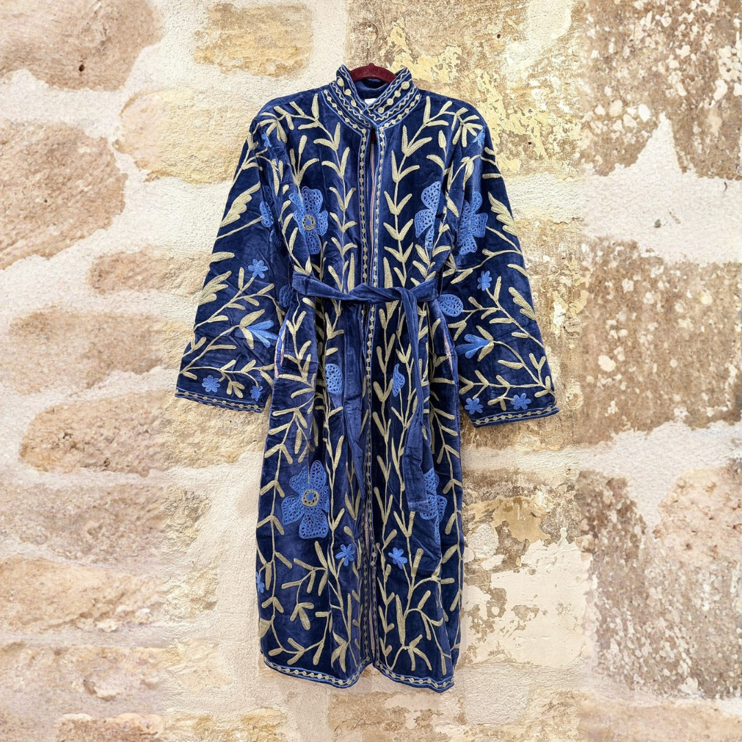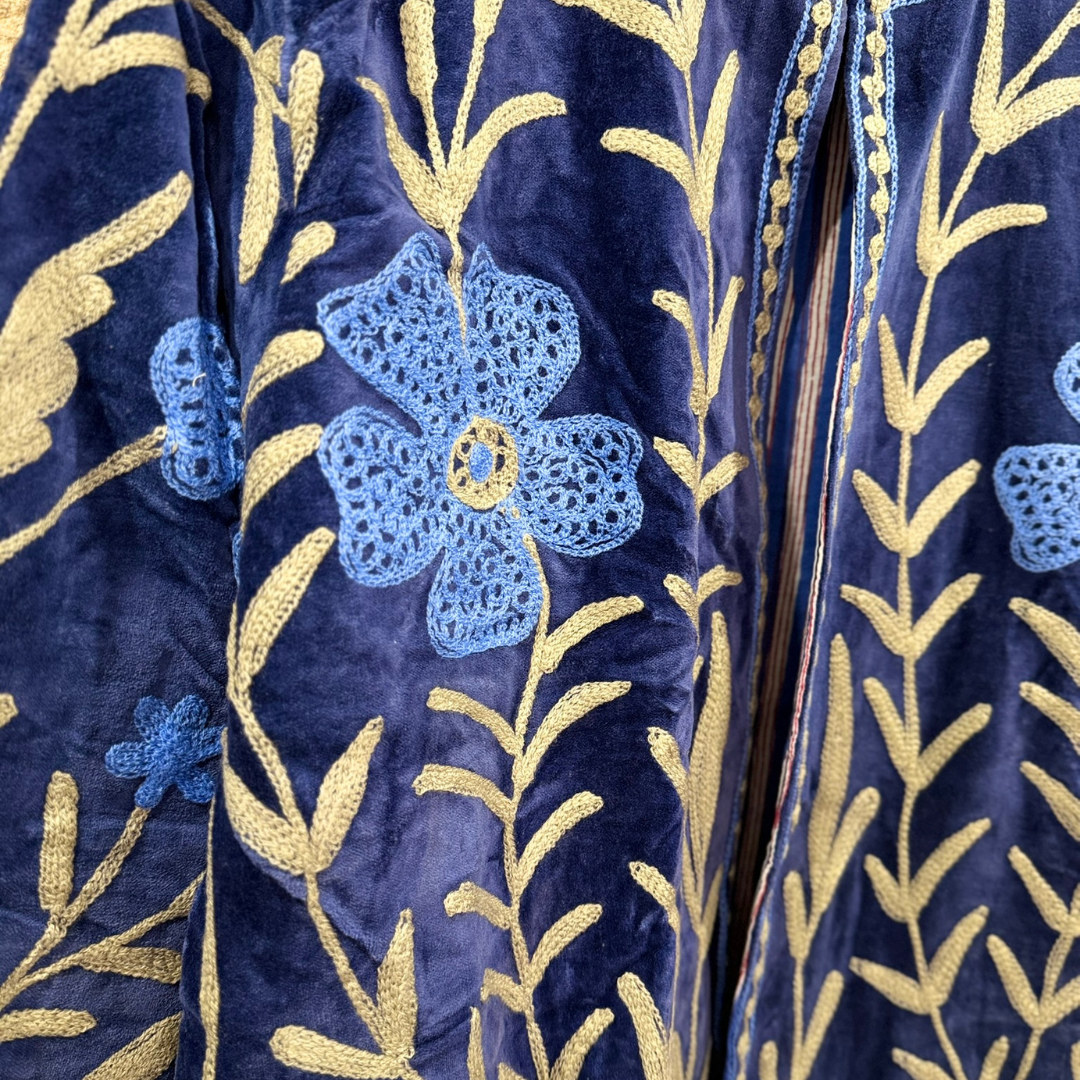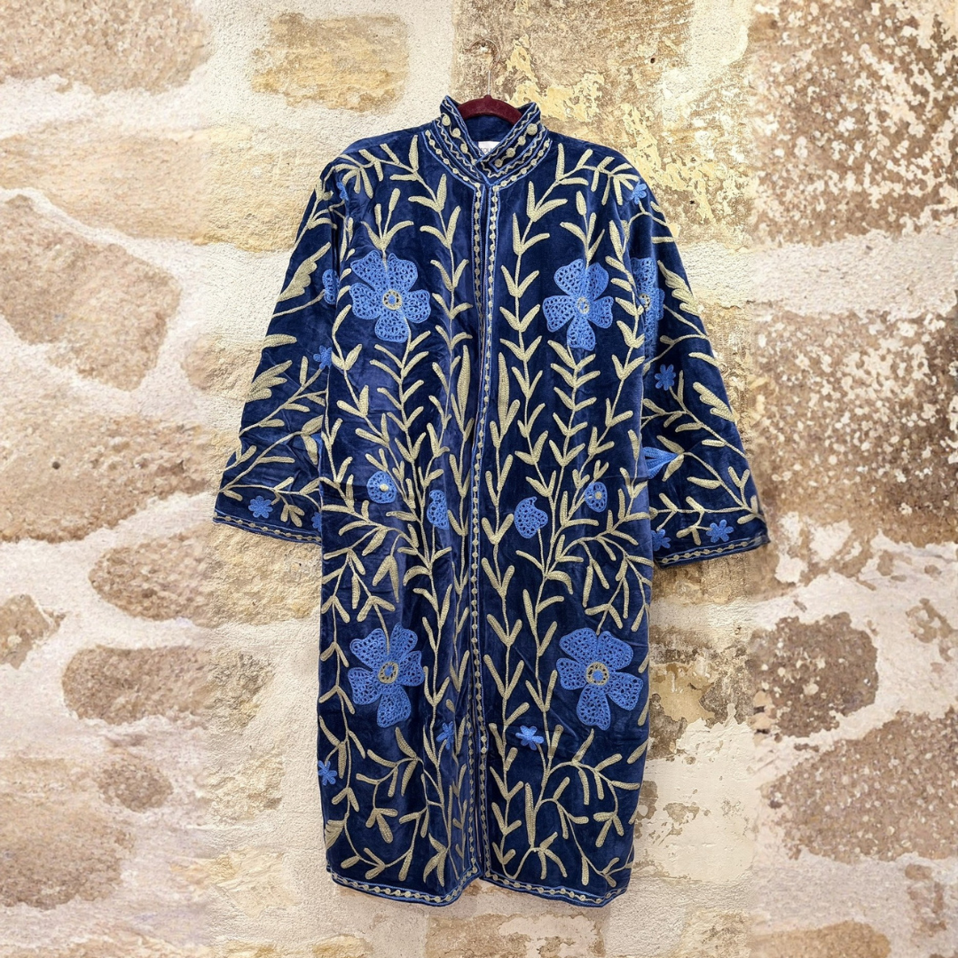 Designed in Paris and handmade in India, each piece is meticulously hand-embroidered and hand-stitched by skilled artisans, making every coat truly one of a kind. The intricate wool embroidery brings depth, texture, and character, while the cotton velvet base provides warmth, durability, and structure—ideal for colder seasons.