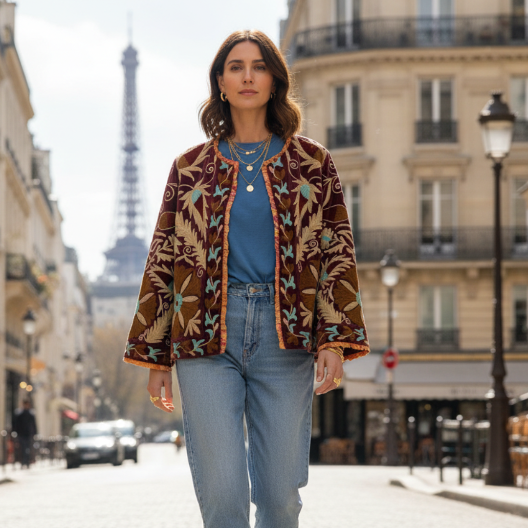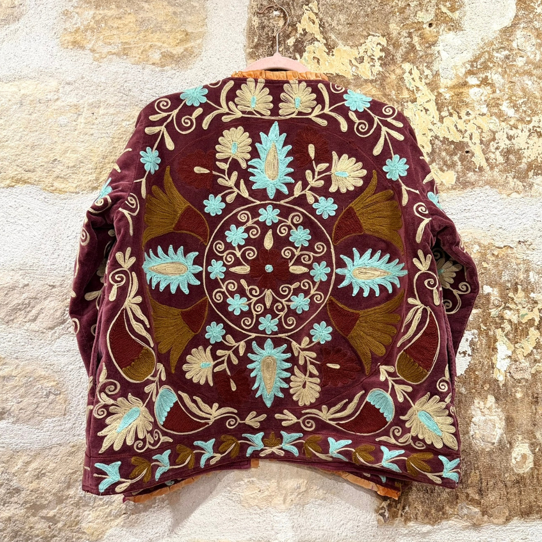 Crafted with exceptional attention to detail, this jacket celebrates the timeless art of Suzani embroidery. Each piece is meticulously hand-embroidered and hand-stitched by skilled artisans, making every jacket one of a kind.