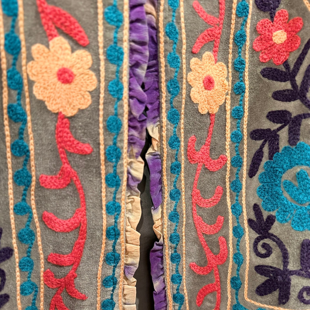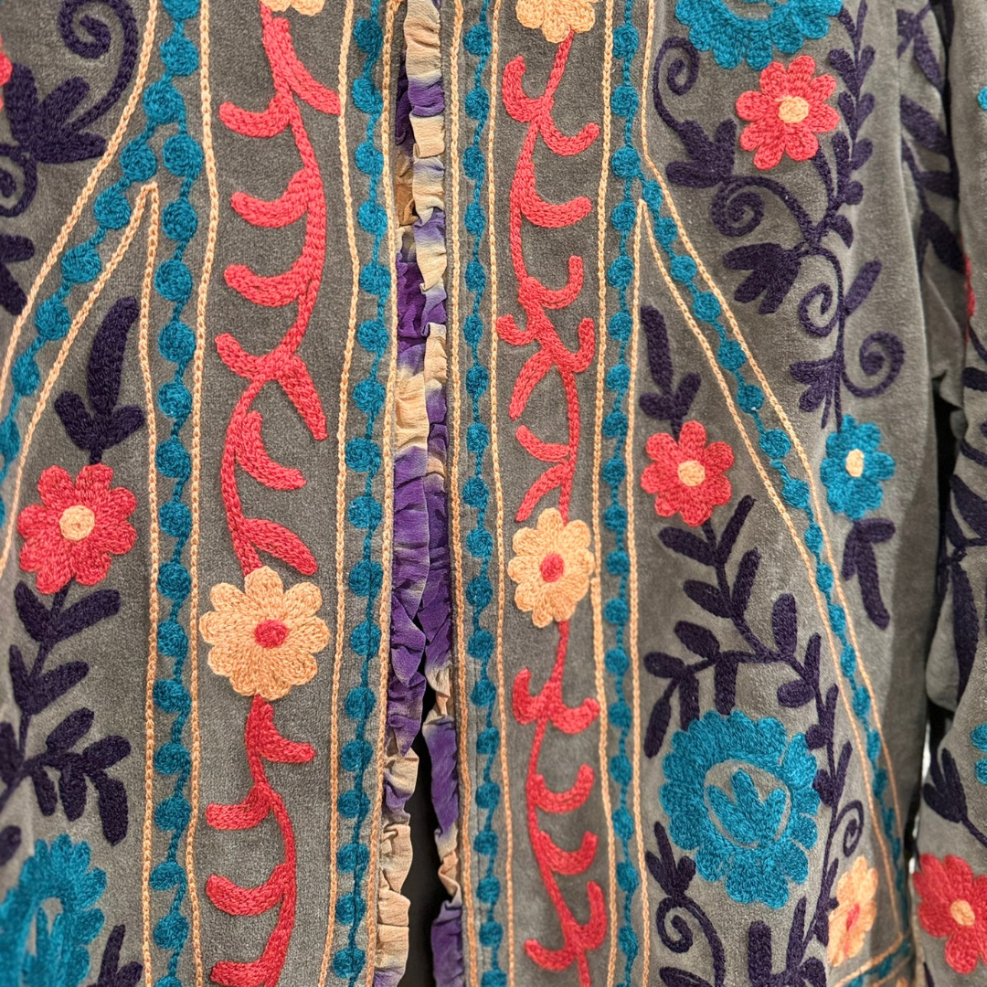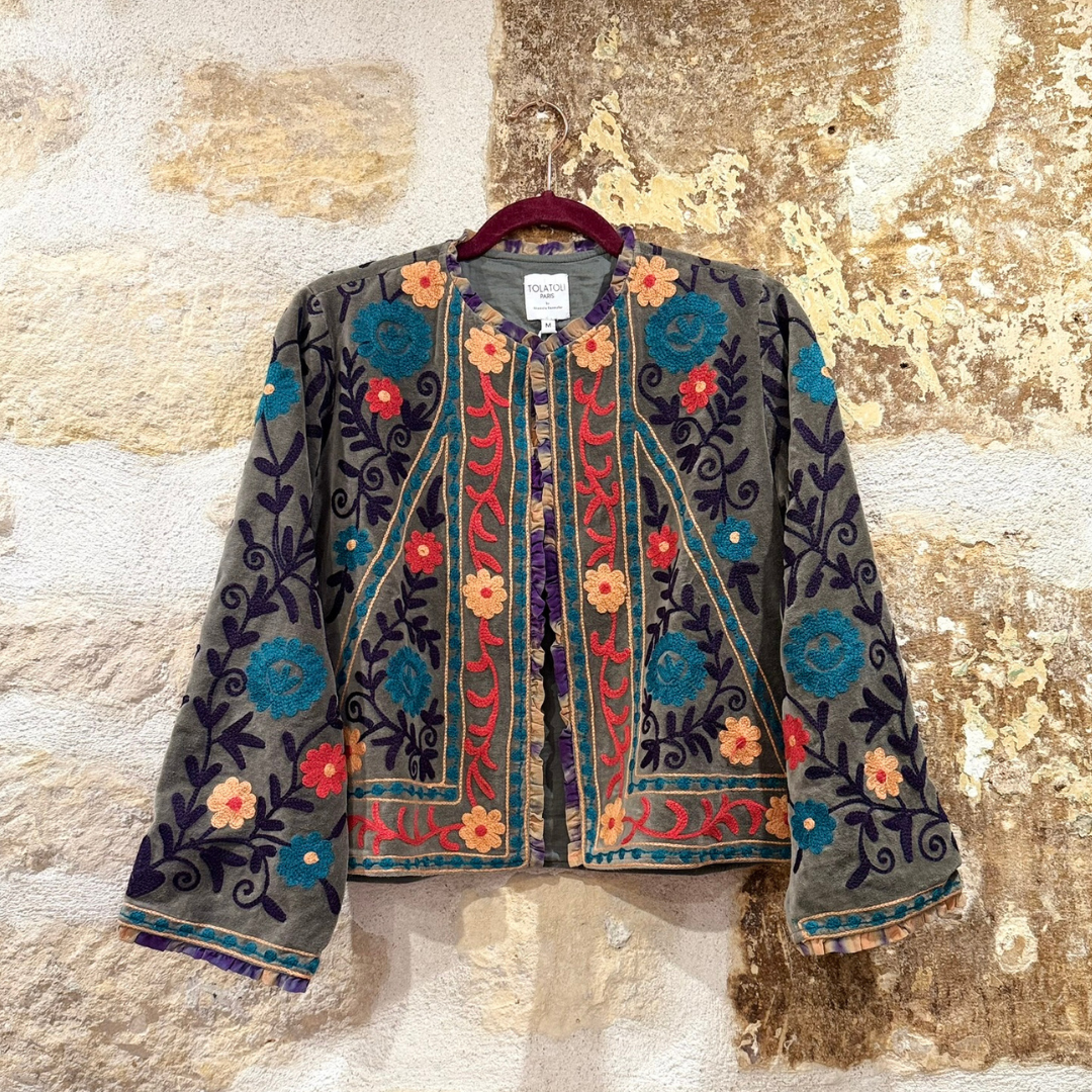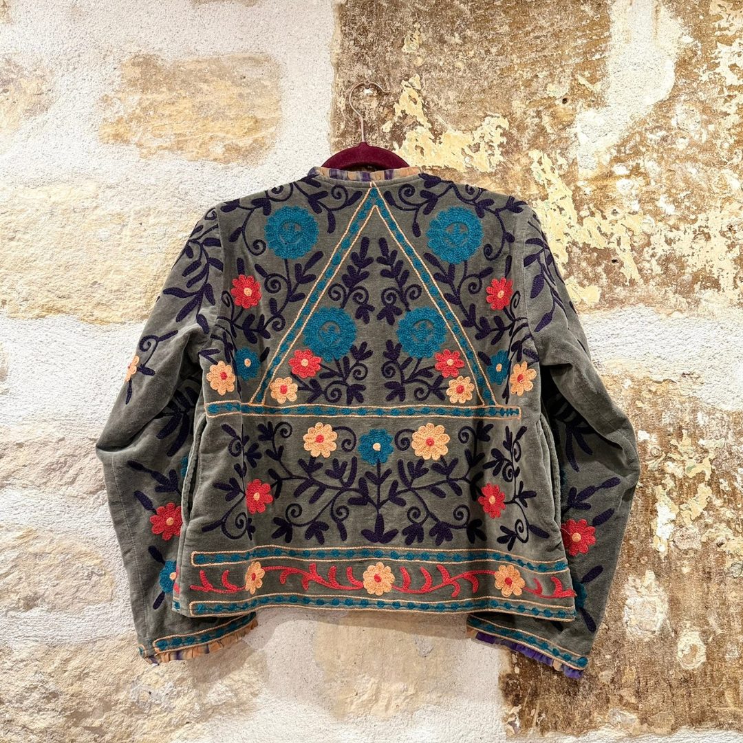 Crafted with exceptional attention to detail, this jacket celebrates the timeless art of Suzani embroidery. Each piece is meticulously hand-embroidered and hand-stitched by skilled artisans, making every jacket one of a kind.